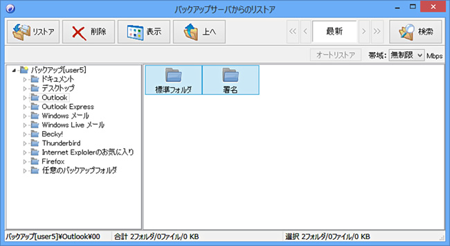 Outlook項目を開き表示されたフォルダを選択し、[リストア]をクリックします。